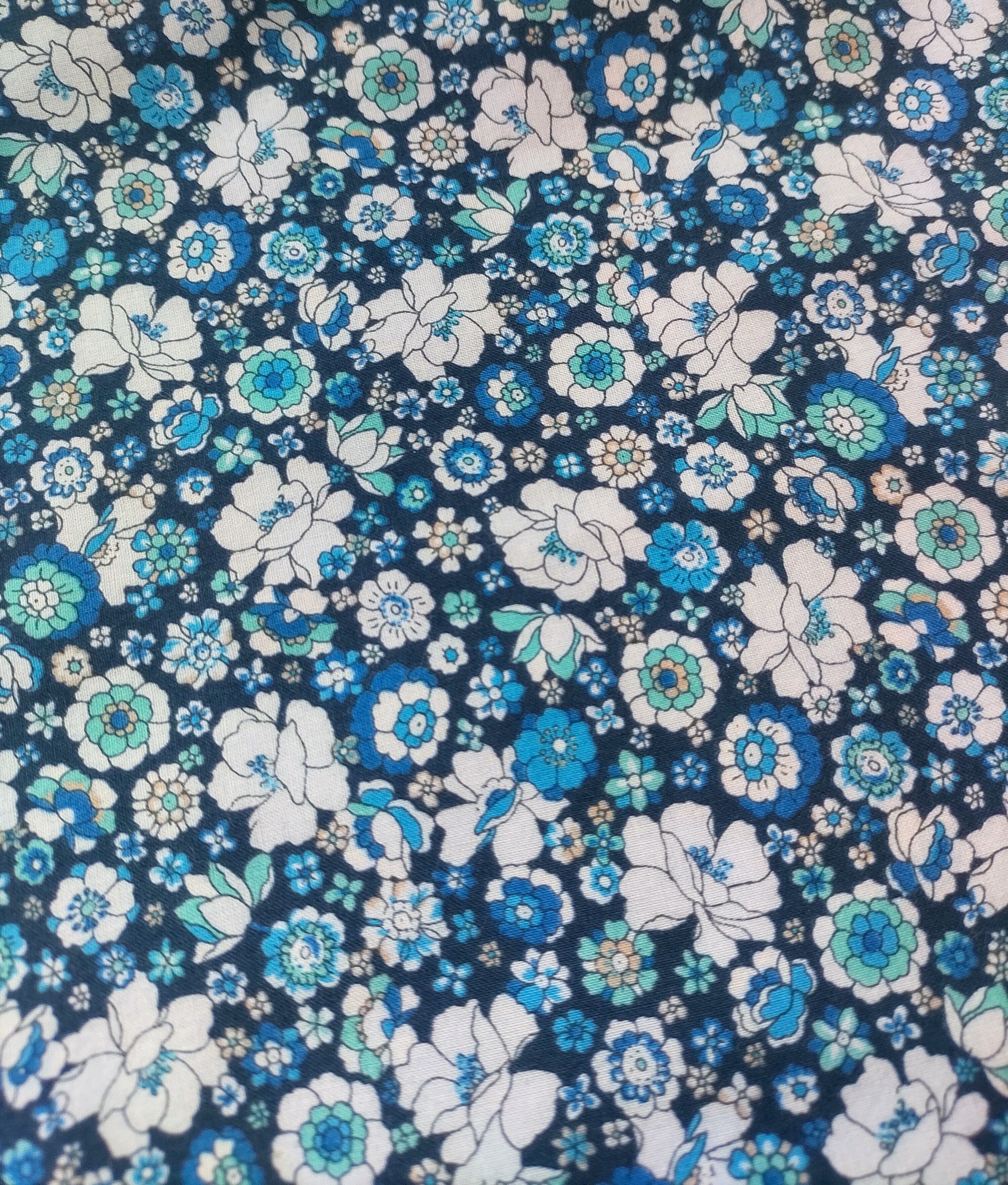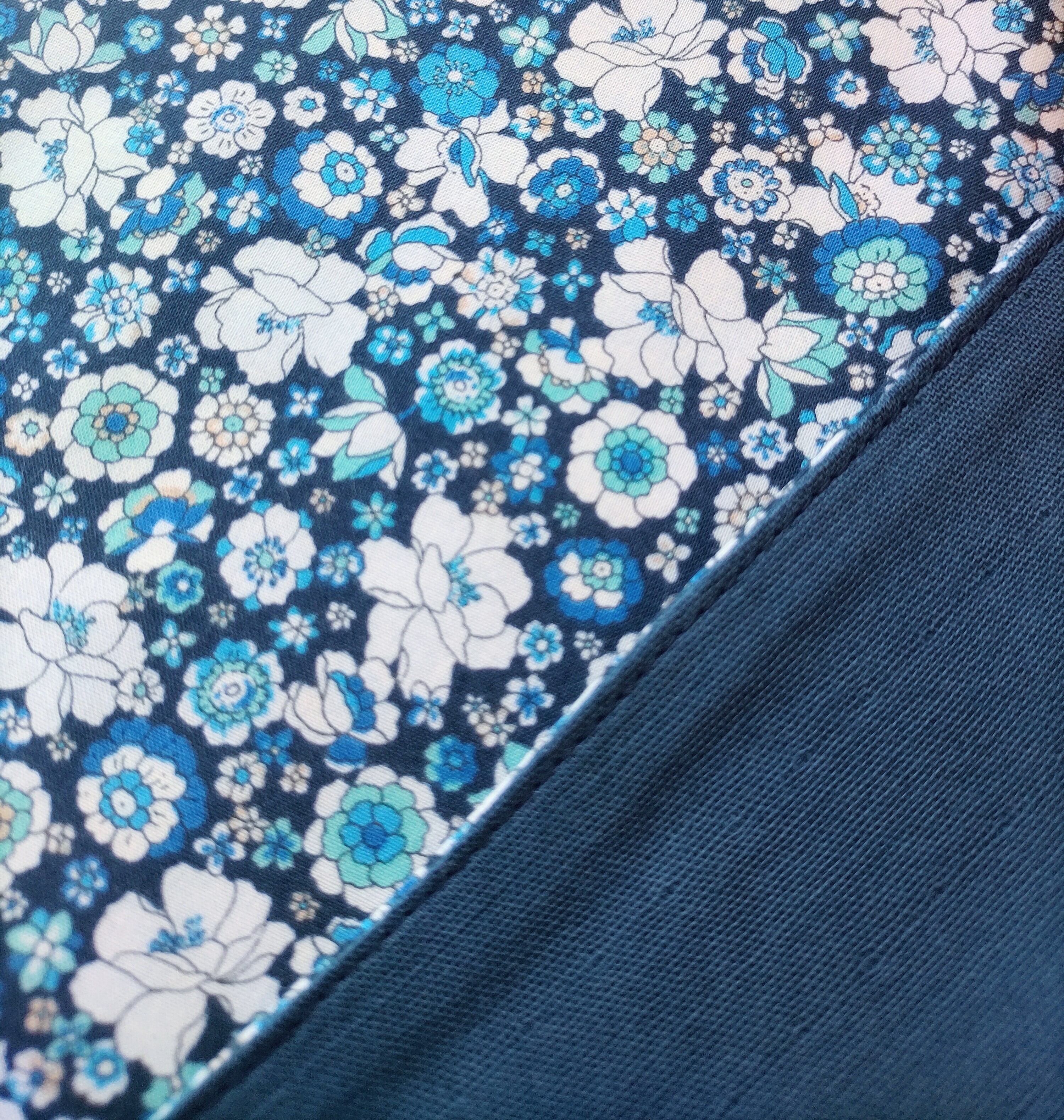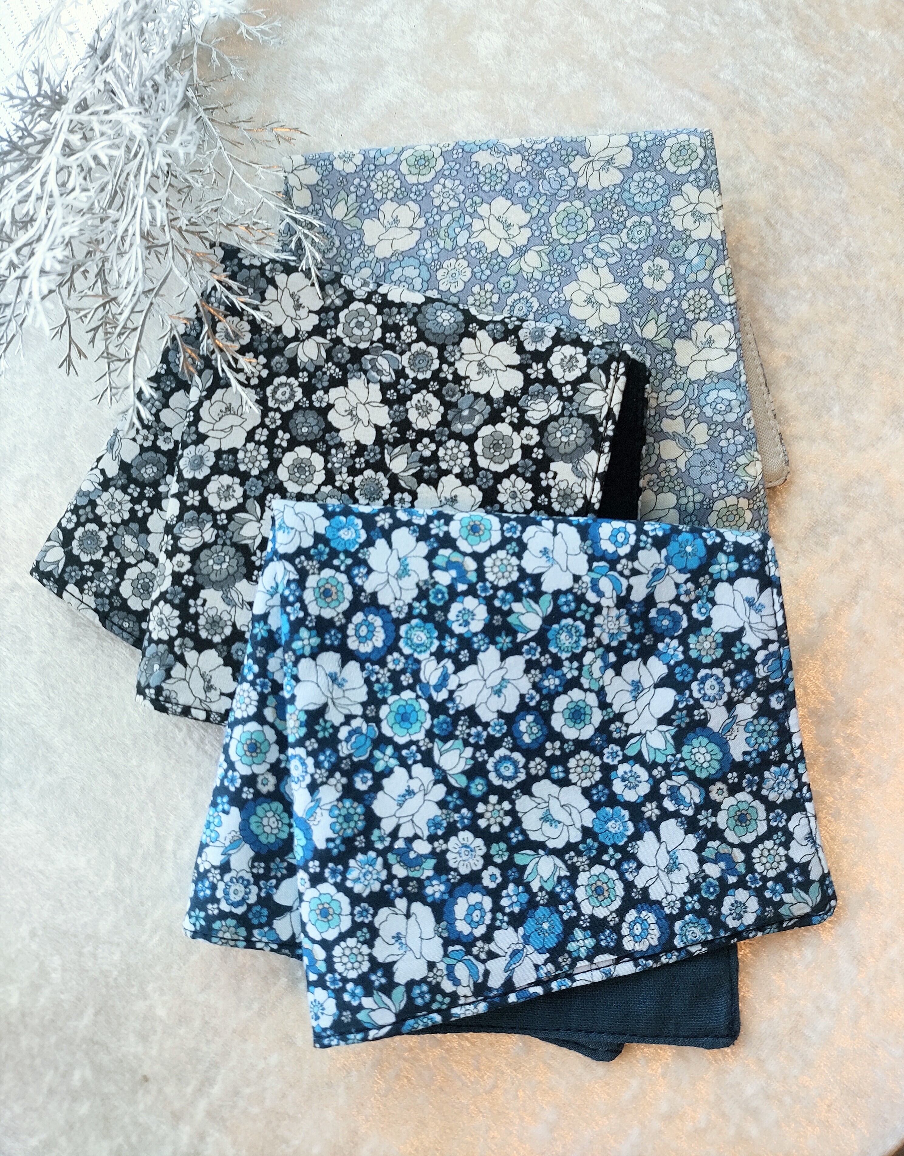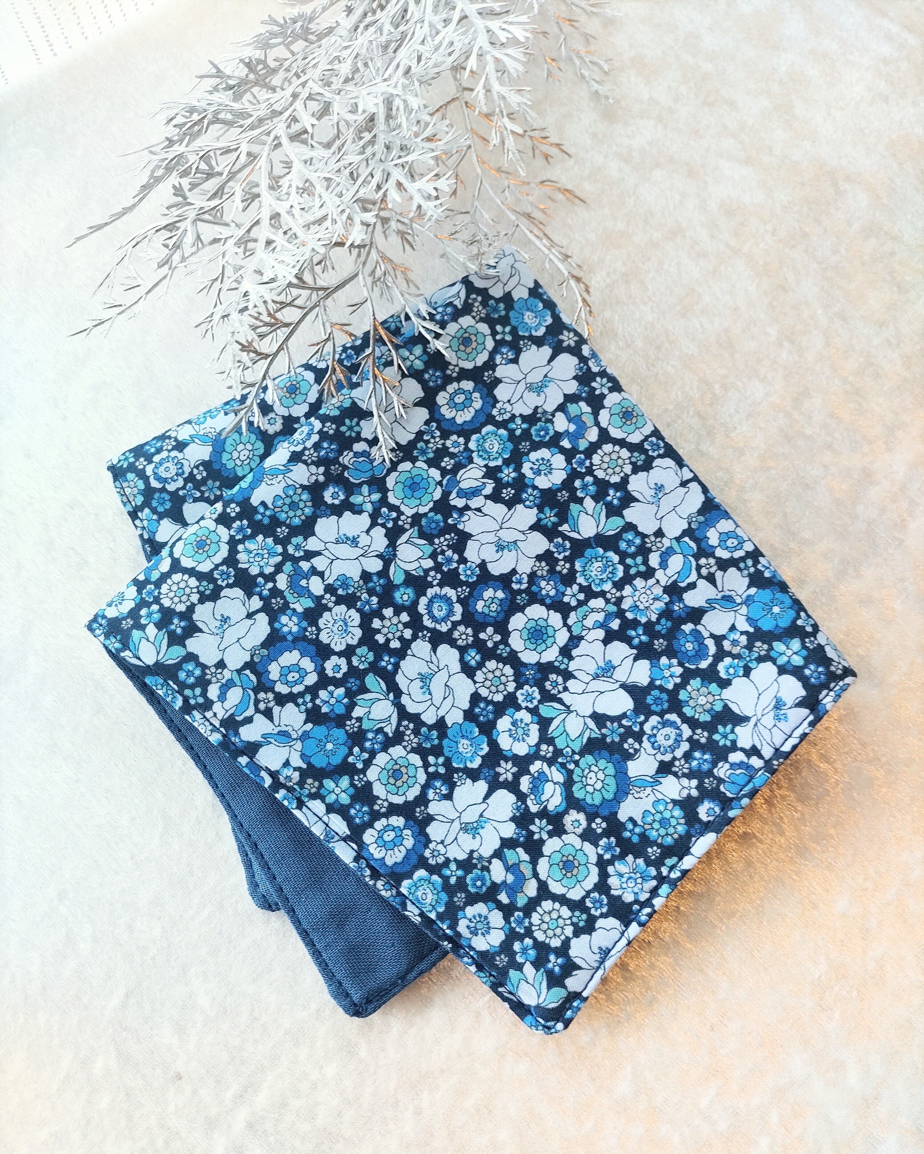 爽やかな青に花柄を散りばめたデザインの綿とガーゼ4枚を重ねて縫いあげた5重仕立てのハンカチです