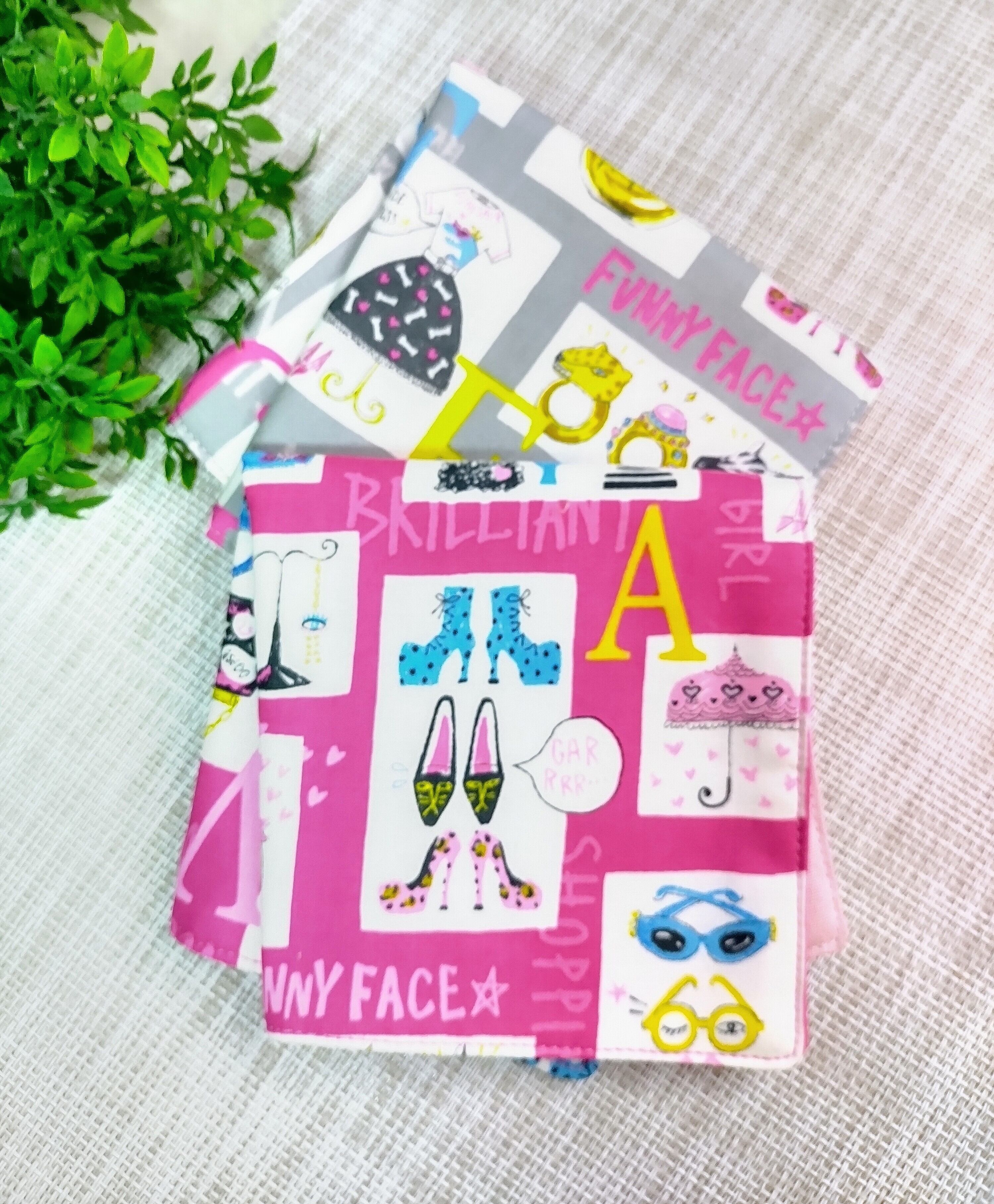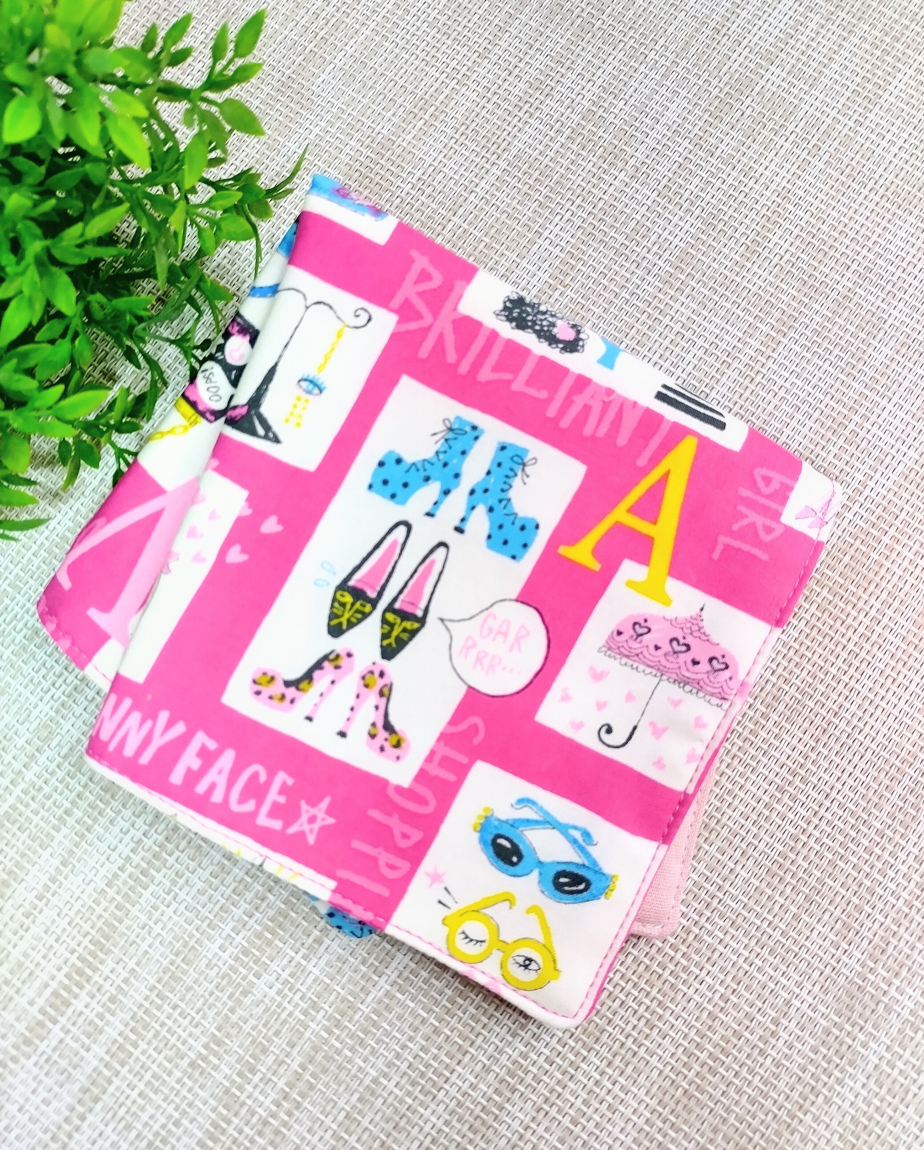 ピンクがかわいいポップなイラストの5重ガーゼハンカチ