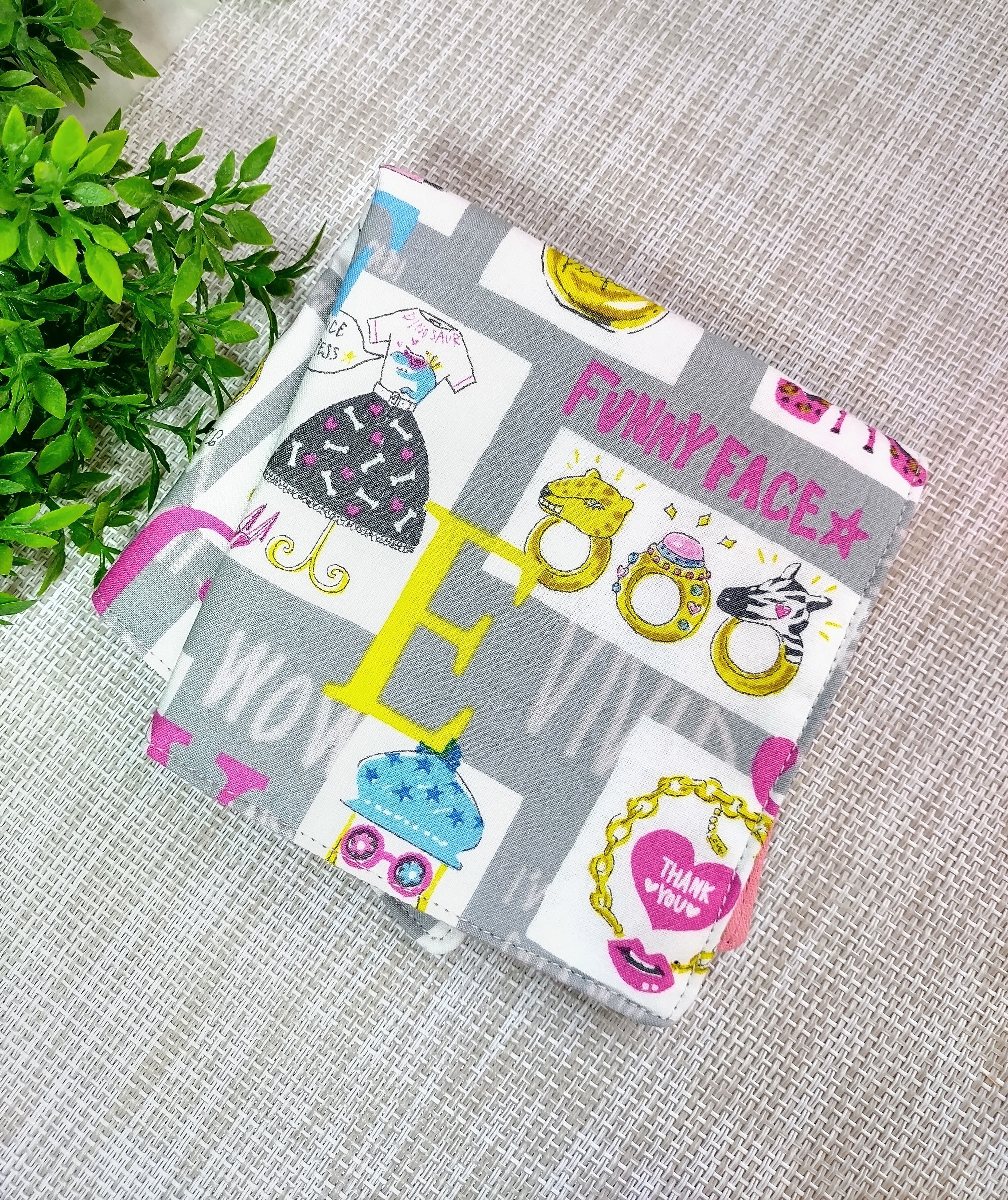 落ち着いたグレー地にポップなイラストの5重ガーゼハンカチ